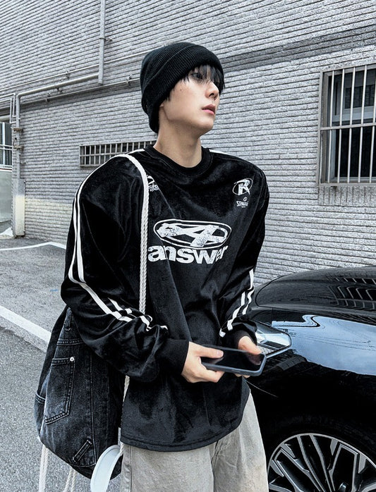 Velour Ribbed Round Neck Long Sleeve Knit Tee